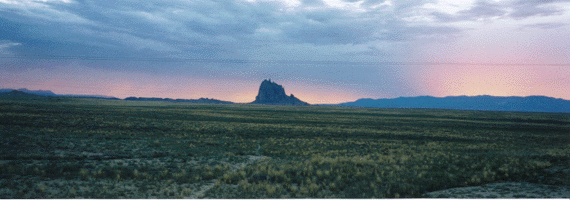 | シップロックから車で2時間ほど行った所にある、シュラインロックにたたずんでます。ここからは360度地平線が見えます。聖なる岩だそうです。大地は所々にブッシュのある荒れ地なんですが、セイジの草木がいっぱいあって、いい香りなんですよ。 インディアンはその草を身体につけて香りを楽しむそうです。(写真左)